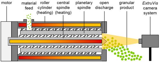 This paradigm shift in the preferred manufacturing type also includes the unit operation granulation [6,7]. In comparison to dry [8,9] and wet granulation [10,11], as the most commonly applied methods in pharmaceutical technology, melt granulation offers the advantage of reduced fines and dust production, as well as the saving of a subsequent drying step [12]. This is especially valuable in terms of sustainability. In addition, this method enables the handling of moisture-sensitive materials [13] or the processing of high-dose formulations with poor compactibility [14]. To date, continuous melt granulation is typically executed on twin-screw machines [15,16,17]. However, the use of a planetary roller granulator, which belongs to the class of multiple screw machines which have already been applied for wet granulation [18,19,20], is a promising alternative [21] due to the basic process concept (Figure 1).