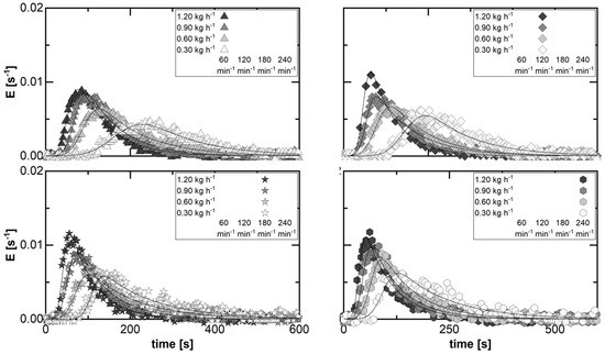 For a constant rotation speed, an increase of the feed rate (encoded by the symbol grey scale) generally results in a shift of the peak as well as of the (Table 2) to shorter exit times, while the absolute width of the RTD decreases. Therefore, the peak height increases as well. In comparison, increasing the rotation speed (encoded by the symbols) for a constant feed rate has the same effect on the RTD profile. These findings are similar to those in twin-screw processes and the impact of direct process parameter variations on the RTD [37]. Furthermore, the other determined characteristic model parameters (Equation (4)) match the visual findings concerning the process parameter impact.