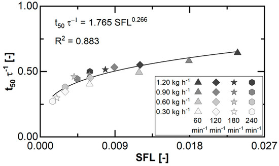 In general, the surrogate for the fill level is constantly below 100% (Table 2) and increases for a higher SFL, and the corresponding correlation fits a power model approach. Therefore, the impact of the investigated process parameter variations and the fill level adjustment in steady state depends on the balance of the acting forces related to the material transport in PRMG.
