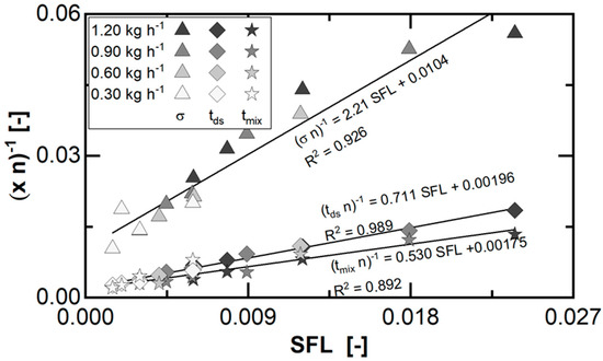 In general, all transformed parameters correlate linearly to the SFL, which justifies the applied parameter transformation. The values for σ are the highest at each set point ((σ n)−1 = 2.21 SFL + 0.0104), as the width of the axial material transport is absolutely lower than the duration of the material transport (Table 2). Furthermore, transport and mixing time are in the same order of magnitude ((tds n)−1 = 0.711 SFL + 0.00196, (tmix n)−1 = 0.530 SFL + 0.00175), since the corresponding mechanisms refer to the same fill volume inside the granulator. The higher values for result from the superimposition of the orbital planetary spindle movement and their self-rotation on the radial distribution by the part toothing. This leads to an apparent increase in the mixing volume in comparison, due to a circulation within and exchange in between distinct material portions continuously during processing along the granulator.