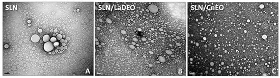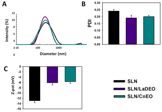 The outcomes of the TEM images were confirmed by a dynamic light scattering (DLS) analysis (Figure 2). For nanoparticles dispersed in aqueous environments, DLS is a more suitable and less-invasive technique than TEM since it reflects the presence of agglomerates and aggregates in a more representative way (indicated by the PDI parameter). The mean diameters of SLN, SLN/LaDEO, and SLN/CnEO were 147, 151, and 141 nm, respectively. The PDI was ≤0.3 in all cases, indicating high compatibility for biomedical purposes [29]. Indeed, SLN/LaDEO and SLN/CnEO displayed a PDI ≤ 0.2, whereas SLN presented a PDI of 0.24. These findings may be attributed to the good emulsion dispersion but also suggest that EO inclusion would promote a reorganization in the SLN structure [20,21,24]. This observation became even clearer when a population of SLN particles larger than 1000 nm vanished after being combined with EO (Figure 1 and Figure 2A), highlighting the monodispersed nature of the SLN/EO formulations. A decrease in the Z-pot of SLN from −12 mV to −5/6 mV was found after the incorporation of EO, which further reinforces the idea that EO would be crucial for SLN restructuring.