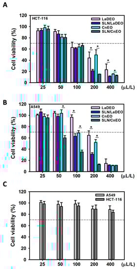 As shown in Section 3.1, LaDEO and CnEO were the most active EOs against lung A549 and colon HCT-116 cells. Nevertheless, EO employment in pharmaceutical products has some restrictions due to its high volatility, low aqueous solubility, chemical instability, and low bioavailability [30]. Intending to determine the potential advantages of EO encapsulation into SLN, the cytotoxic activity of free and SLN/EO (SLN/LaDEO and SLN/CnEO) was explored in A549 and HCT-116 cells. The cells were incubated with increasing amounts of free and encapsulated EO (25–400 µL/L) and equivalent amounts of unloaded SLN for 24 h (Figure 3).