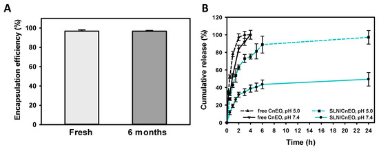 CnEO EE and cumulative release. (A) CnEO EE (%). (B) CnEO release from SLN/CnEO at pH 7.4 and 5.0. Values are expressed as the mean ± SD (n = 3).