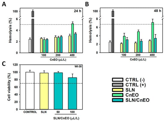 Biocompatibility of SLN/CnEO. (A,B) Hemotoxicity of empty SLN, free CnEO, and SLN/CnEO. Hemotoxicity of 100, 200, and 400 µL/L CnEO and equivalent doses of empty SLN and SLN/CnEO were evaluated after 24 h (A) and 48 h (B) of exposure. Results are expressed as the mean ± SD (n = 3). (C) (−): untreated; (C) (+): 1% Triton X-100-lysed erythrocytes. (C) Effect of SLN/CnEO on normal lung WI-38 fibroblasts. Cells were exposed to SLN/CnEO (50 and 100 µL/L), and cell viability was evaluated by the MTT assay after 24 h. Results are expressed as the mean ± SD (n = 6). Of the viability, 70% is indicated by the dotted line; below that, the treatment could be considered cytotoxic.