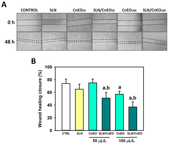 Encapsulation of CnEO increases the inhibition of A549 cell migration. Cell migration was analyzed by the wound healing assay. Cells were exposed to 0.1% ethanol (control), empty SLN, free CnEO, or SLN/CnEO (50 and 100 µL/L) for 48 h. (A) Representative images were obtained at 0 and 48 h (40×). (B) Quantitative analysis of wound healing closure. Data are presented as the mean ± SD (n = 4). (a) p < 0.05 vs. Control; (b) p < 0.05 vs. equivalent concentration of free CnEO.