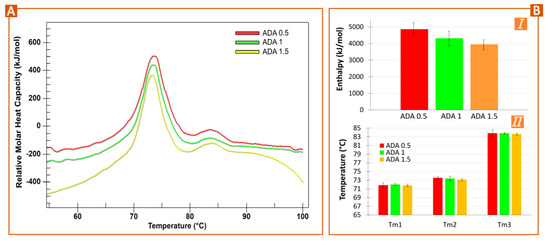 Effect of ADA concentration in nano-DSC results (A,B). (A) Original nano-DSC thermograms for 0.5 to 1.5 mg/mL of ADA diluted in water. “Relative molar heat capacity” was used in the y-axis since the thermograms have been manually shifted in height to allow easier comparisons. (B) Results obtained after deconvolution of nano-DSC thermograms using Voigt model (I) total enthalpy and (II) melting temperature of the three ADA unfolding events.