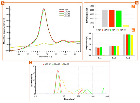 From these results, it is possible to conclude that temperature-stress conditions for ADA translate into an enthalpy decrease with no significant changes in transition midpoints when analyzed by nano-DSC. It has already been reported that temperature-stress conditions induce ADA aggregates of different MW and solubility [22,24]. Wu et al. stated that aggregation is temperature dependent, having an Arrhenius regime for T ≥ Tm1 (CH2 transition midpoint) or a non-Arrhenius regime for T < Tm1 [25]. This particle aggregation was confirmed by DLS measurements (Figure 2C). The particle profiles and mean size of ADA RT and ADA 40 are similar to the dimension profile of ADA already reported in the literature [26], although the differences can be attributed to the sample composition and experimental conditions. ADA 80 reported a clear increase in particle size, as shown by the shifting of the signal toward higher diameters.