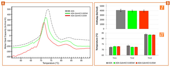 Forced degradation: effects of GdnHCl denaturant. (A) Nano-DSC thermograms of ADA (1 mg/mL) diluted in GdnHCl 0.005 M and 0.05 M compared with the commercial formulation. (B) Total enthalpy (I) and temperature midpoints (II) obtained after deconvolution of the thermogram’s samples (Voigt model).
