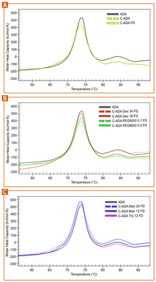 The concentration and lyophilization process of ADA is expected to trigger instability of the molecule due to the (i) increased antibody concentration, hypothetically leading to easier unfolding due to closer protein-protein interactions, as proved in Figure 1, and (ii) removal of excipients during concentration. After the concentration process, the original ADA concentration (100 mg/mL) increased up to 234.55 ± 54.85 mg/mL. The osmolarity values reduced from 0.274 Osm/L for ADA (100 mg/mL) to 0.150 Osm/L for C-ADA (100 mg/mL), proving the loss of part of the excipients during the concentration procedure. The thermograms of both C-ADA before and after lyophilization (C-ADA FD, Figure 4A) show a decrease in enthalpy in comparison to ADA. Additionally, a small shift toward lower temperatures can be observed for these samples versus the commercial formulation, especially around 65–70 °C. This shoulder could be related to a shift of the CH2 fragment toward smaller temperatures and so an instability of this particular fragment. The need to include other excipients in the concentrated formulation is therefore clear, the primary objective being the improvement of the monoclonal antibody stability after the concentration and freeze-drying step.