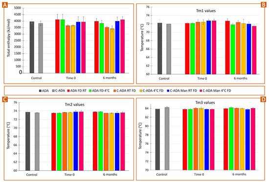 The transition midpoint temperatures (Tm1, Tm2 and Tm3) were constant for ADA, ADA RT, and ADA 40 (Figure 2B,II). By looking at the thermogram of ADA 80 (Figure 2A, yellow line), the CH3 thermal event was practically superimposed over the others. Due to the small size of the thermal event in the ADA 80 thermogram [23]