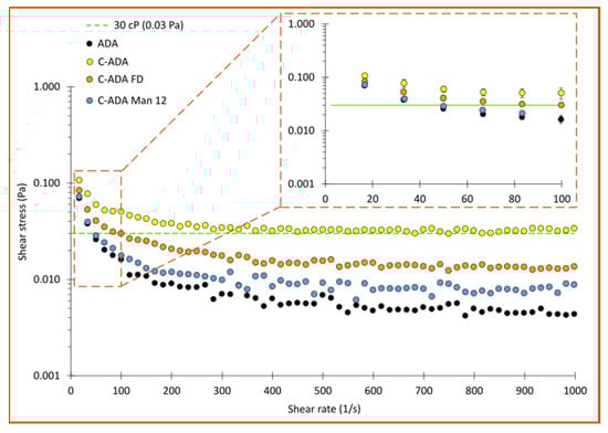 As expected, C-ADA (yellow dots, Figure 7) showed a remarkably higher viscosity in the whole range with respect to ADA (black dots). Taking as a reference the critical viscosity value reported by Roche et al. [49] (0.03 Pa), syringeability of the C-ADA formulation can be considered non-optimal (likely to cause some device complications and/or user inconveniences during injection), independently of the stress applied (η values > 0.03 Pa). Interestingly, this viscosity decreased after the freeze-drying and reconstitution (C-ADA FD, orange dots), and was even lower for the C-ADA Man sample (also after freeze-drying and reconstitution). The viscosity reduction in C-ADA FD vs. C-ADA could be related to a partial unfolding/denaturation of the protein during the freeze-drying process, as reported by the nano-DSC total enthalpy values of this sample vs. C-ADA and ADA (Figure 6A). In the case of C-ADA Man, the viscosity decrease is more interesting since the nano-DSC results did not show significant enthalpy losses or thermal instability signs. The C-ADA Man sample possessed very similar viscosity values at low shear rates (see the enlarged section of the curve), the difference becoming more noticeable at higher shear rates.