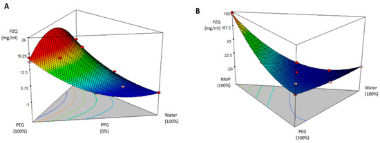 The response surface methodology (RSM) is widely used to estimate how the factors (co-solvent ratio) can influence the response (PZQ solubility). Herein, the results obtained from the experiments (Table 1) revealed a direct relationship between the solvent concentrations and PZQ solubility. In the case of System 1 (PEG 400/PPG/water), the drug solubility increased when the proportion of the PEG 400 was increased against the water proportion while keeping the concentration of PPG constant. In the case of System 2 (PEG 400/NMP/water) where the drug solubility kept increasing as the proportion of NMP increased while keeping the concentration of PEG 400 constant, suggesting that the solvent polarity is fundamental in the solubilization of the non-polar PZQ [43,44]. In Figure 1 there is a clear trend of decreasing PZQ concentration, which was expected, as the presence of water, the most polar solvent, increased. As shown in Figure 1A, the findings revealed that the optimum value of PZQ was 14.80 ± 0.24 mg/mL, which corresponds to the co-solvent system PEG 400 (67%), PPG (16.5%), and W (16.5%), while the system containing PEG 400 (16.5%), PPG (67%), and water (16.5%) solubilized 12.25 ± 0.33 mg/mL of the drug.