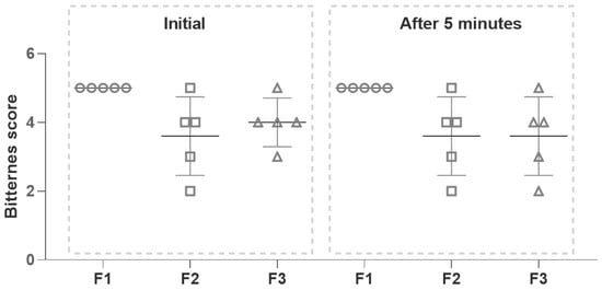 Thus, for reducing PZQ bitterness, strawberry and mint flavors were evaluated as potential taste masking [54]. Sucralose, a calorie-free artificial substance nearly 600 times sweeter than sucrose and three times sweeter than aspartame, was selected as a sweetener due to its stability, safety, and palatability [55]. The bitterness intensity of PZQ solutions was determined in a randomized assay under the same conditions using a panel of human volunteers in an intake and spit test [56]. The tested formulations were not swallowed. The bitterness level of the optimized final formulation containing strawberry and sucralose (F2) or mint and sucralose (F3) was rated and compared with a solution of PZQ without flavors and sweetener (F1). As seen in Figure 2, the IT assay of the F2 solution indicated that one volunteer scored a value of 5, two volunteers scored a value of 4, one volunteer scored a value of 3, and the other one a value of 2. Concerning the F3, the IT showed that one volunteer scored a value of 5, three volunteers scored a value of 4, and one volunteer scored a value of 3. In the case of the AT assay, the performance of F2 was identical to the IT assay, and the evaluation of F3 showed a slight modification because one volunteer scored a value of 5, two volunteers scored a value of 4, one volunteer scored a value of 3 and the other one a value of 2. These results suggested that both strawberry and mint flavors would be effective additives to reduce the bitterness of PZQ to some extent (25%–75%).