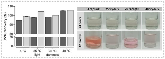 The long-term stability of liquid formulations represents one of the main issues since drug precipitation is a very feasible problem, alongside with degradation of the active ingredient. Herein, the effect of pH, storage temperature, and light on the stability of PZQ was evaluated. According to these findings, the pH of the PZQ-optimized NMP/PEG 400/W solution was kept constant during the considered time in all conditions studied. In this regard, United State Pharmacopeia (USP) has identified three impurities related to PZQ: impurity A, impurity B, and impurity C. Regardless that PZQ concentration shows little or no change over time within the acceptance criteria for that attribute, as it is defined by different pharmacopeias for oral solution dosage forms (90.0% ≤ labeled amount ≤ 110.0%), the presence of its pharmacopeia impurities was observed after diverse storage conditions. In samples stored at 40 °C non-significant differences were found in recovery percentage after storage (p = 0.1354) (Figure 4). In the other evaluated storage conditions, recovery percentages were higher than expected (p = 0.0023 for 4 °C and p = 0.0001 for 25 °C with/without light exposure).