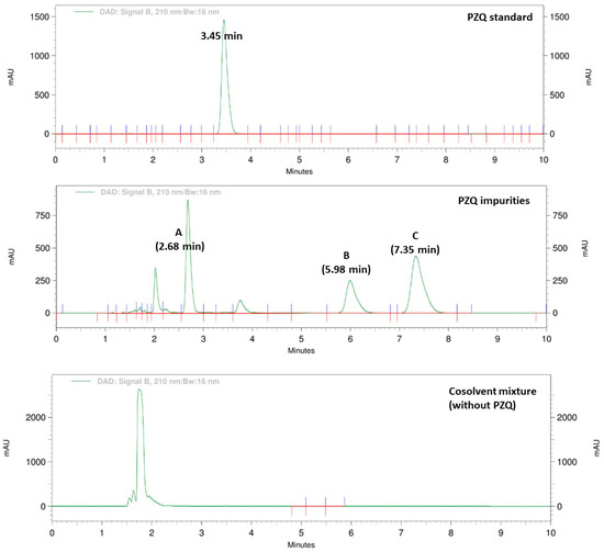 Chromatograms of pure PZQ, the mixture of PZQ USP impurities, and the cosolvent mixture (without PZQ).