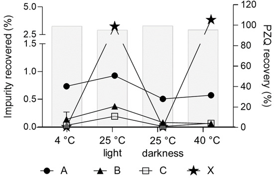Impurities generated at different storage conditions over a period of 12 months (y-left axis). The recovery% of PZQ is shown as light-grey bars (y-right axis).
