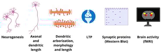 Structural plasticity usually refers to the morphological and developmental changes in neurons and synapses along neurodevelopment, i.e., the remodeling of neuronal circuits or synapses (e.g., synaptic pruning) or the generation of new nerve cells (i.e., neurogenesis) or synapses (i.e., synaptogenesis) either in developmental stages or in neuronal repair mechanisms [,]. Parameters such as number of new neurons, axon and dendritic length, number and stability of dendritic arborizations, and number and morphology of synaptic boutons, can be measured in post-mortem human or animal brain tissue []. The activity of neurons can be assessed at the level of networks in the resting state and under conditions of hypo- or hyper-connectivity. The latter can be studied indirectly in humans through nuclear magnetic resonance (NMR) imaging (MRI) or functional MRI (fMRI) [].