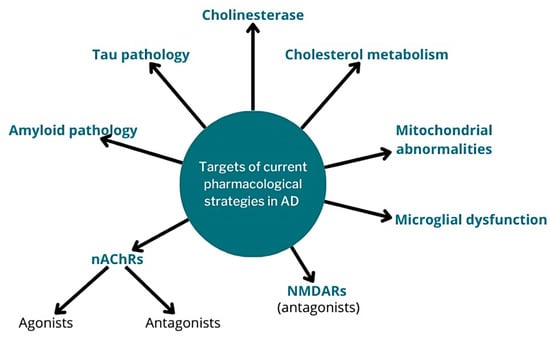 Therapeutic strategies that target secondary mechanisms other than amyloid and tau pathologies have also been explored, such as those aimed at mitochondrial abnormalities [], microglial dysfunction [], or cholesterol metabolic alterations (such as those employed in the treatment of coronary disease and atherosclerosis), often combined with classical anti-amyloid drugs []. A schematic categorization of the current pharmacological strategies is shown in Figure 2.