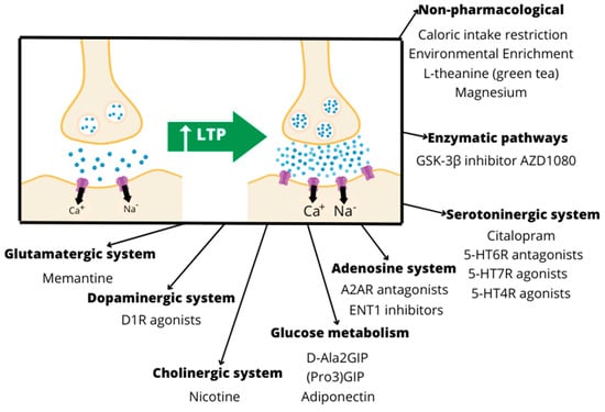 Citalopram is another antidepressant that can ameliorate Aβ production and deposition in AD mice and human brains. Additionally, the administration of citalopram in an animal AD model was shown to reverse Aβ-induced LTP impairment in the hippocampus. Its effect on LTP was explained by two mechanisms: (1) a restoration of the number of 5-HT receptors, which increases serotonin levels and restores LTP, and (2) a decrease in the levels of Aβ accumulation in the hippocampus, which is known to inhibit LTP []. LTP was also rescued by the chronic administration of the serotonin type 6 receptor (5-HT6R) antagonist [] and by the chronic administration of a serotonin type 7 receptor (5-HT7R) agonist [], in a rat model.