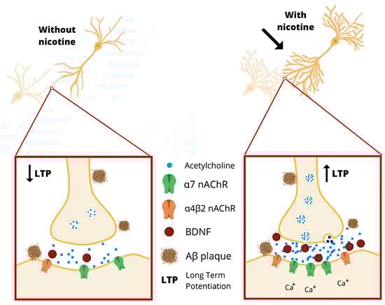 Chronic nicotine administration has been shown to prevent Aβ-induced inhibition of synaptic transmission and LTP in the hippocampus; to downregulate α7 and α4 nAChRs, presumably by increasing BDNF levels []; and to increase dendritic density in the CA1 area of the hippocampus when administered chronically []. α7 nAChRs are considered a potential target owing to their essential role in different mechanisms of synaptic plasticity [,] (Figure 4).