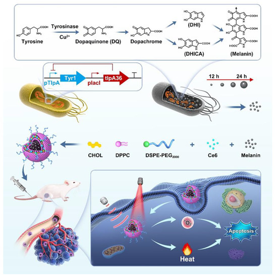 Melanin is a natural polyphenol substance existing in biological tissues, including the hair and skin of mammals, the ink of cuttlefish, black sesame, bacteria, etc. [34,35,36,37,38]. Also, melanin is an endogenous chromophore with photoacoustic (PA) imaging capability, exhibiting high sensitivity and spatial resolution in in vivo deep-seated tissues [39]. Generally, there are two main ways to obtain melanin NPs. One is chemical synthesis, and the other is biological extraction. The former is environmentally unfriendly and has poor biocompatibility, and the latter is procedurally complex, low efficiency, and expensive. Herein, we explored a biosynthetic route to obtain melanin NPs via genetically engineered bacteria and fabricated the SDT/PTT dual-functional liposomes (designated as MC@Lip) by encapsulating the biosynthetic melanin NPs into a hydrophilic core and Ce6 into the hydrophobic lipid shell. The genetic circuit, which harbors a tyrosinase gene named Tyr1 under the control of a TlpA promoter inhibited by the temperature-sensitive repressor protein (TlpA36), was introduced into E.coli. The genetically engineered bacteria can express tyrosinase in a temperature-induced manner, catalyzing Tyrosine substrate to convert into melanin. The relatively slow biosynthetic procedure makes it possible to fabricate different particle sizes of melanin NPs by controlling the incubation time of bacteria with tyrosine substrate. The biosynthetic melanin NPs with 8 nm particle size and Ce6 sonosensitizer were further encapsulated into liposomes via the filming-rehydration method and obtained the MC@Lip. After these resulting MC@Lip were further intravenously administrated into the tumor-bearing mice, they would target the tumor site by the enhanced permeability and retention (EPR) effect. Upon the MC@Lip becoming enriched in the tumor, they would be received with acoustic and laser irradiation, activating the combined treatments of SDT and PTT and greatly improving the anti-tumor efficacy (Figure 1).