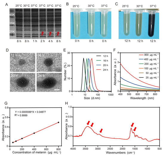 (A) The sodium dodecyl sulfate polyacrylamide gel electrophoresis (SDS-PAGE) revealed the expression of tyrosinase by the genetically engineered bacteria at the different temperatures of 25 °C, 30 °C, or 37 °C for various times. (B,C) The color changes of bacterial solution after adding L-tyrosine and CuSO4 into the genetically engineered bacteria incubated at the different temperatures of 25 °C, 30 °C, or 37 °C before (B) or after (C) 12 h. (D) Transmission electron micrograph showing the morphology of biosynthetic melanin, with size ranged from 8 to 35 nm. Scale bar = 10 nm. (E) Dynamic light-scattering analysis for the particle size of biosynthetic melanin. (F) The absorbance spectra in UV-Vis-NIR of biosynthetic melanin at different concentrations. (G) The linear relationship between the concentration of biosynthetic melanin and absorbance at the 808 nm wavelength. (H) FTIR spectra of biosynthetic melanin. Peaks (marked with red arrows) were 1546 cm−1 for C=C vibration in aromatic ring, 1683 cm−1 for C=O carbonyl group of carboxylic acid, 2946 cm−1 for poly O-H hydroxyl, 3300 cm−1 for N-H, and 3429 cm−1 for free O-H hydroxyl vibration.