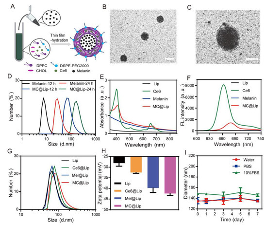 (A) Schematic illustration of the fabrication of MC@Lip. (B) TEM image of MC@Lip. Scale bar = 100 nm. (C) TEM image of single MC@Lip. Scale bar = 50 nm. (D) Dynamic light-scattering analysis of biosynthetic melanin and MC@Lip. (E) The absorption spectra in UV-vis-NIR and (F) the fluorescence spectra of liposome, Ce6, biosynthetic melanin, and MC@Lip. (G) Hydrodynamic sizes of Lip, Ce6@Lip, Mel@Lip, and MC@Lip. (H) Zeta potential of Lip, Ce6@Lip, Mel@Lip, and MC@Lip. (n = 3). (I) Changes in the diameter of MC@Lip stored in water, PBS, or 10% FBS at 4 °C for different durations.