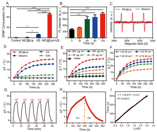 (A) Relative DBPF consumption of PBS or MC@Lip under US irradiation. (n = 3, * p < 0.05 and *** p < 0.001). (B) The ROS production of MC@Lip irradiated by US for different times. (n = 3, ** p < 0.01 and *** p < 0.001). (C) ESR signals of MC@Lip or biosynthetic melanin under US irradiation. (D) The plot of temperature elevation (ΔT) of MC@Lip (melanin concentration: 200 μg mL−1), Lip, melanin (200 μg mL−1), and Ce6 (12 μg mL−1) suspension exposed to the NIR irradiation (808 nm, 1.00 W cm−2, 5 min). (E) Plot of temperature elevation (ΔT) of pure water and MC@Lip suspension at a various concentrations (25, 50, 100, and 200 μg mL−1) under NIR irradiation (808 nm, 1.00 W cm−2, 5 min). (F) Plot of temperature elevation (ΔT) of MC@Lip (melanin concentration: 200 μg mL−1) suspension under various power densities of NIR irradiation (808 nm, 0.75, 1.00, 1.25 and 1.50 W cm−2, 5 min). (G) The plot of temperature elevation (ΔT) of MC@Lip (melanin concentration: 200 μg mL−1) irradiated by an 808 nm laser (1.00 W cm−2) for five irradiation cycles. (H) The plot of temperature elevation (ΔT) of MC@Lip (melanin concentration: 200 μg mL−1) that responded to the 808 nm laser (1.00 W cm−2) on/off. (I) Linear time data versus −Ln(θ) attained from the cooling stage after NIR laser off.