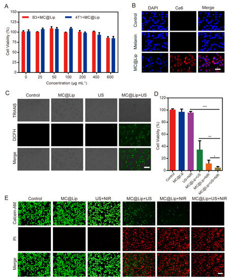 (A) Cytotoxicity of MC@Lip to bEnd.3 and 4T1 cells. (B) The fluorescence images of 4T1 cells stained by DAPI after the incubation with MC@Lip or melanin. Scale bar = 50 µm. (C) The fluorescence images of DCFH-DA-stained 4T1 cells after various treatments. Scale bar = 100 µm. (D) The viability of cells treated with or without MC@Lip under US (1.7 W cm−2, 1 min) and/or laser (1.00 W cm−2, 5 min). (E) The fluorescence images of cells under the above treatment stained with Calcein AM/PI assay. Scale bar = 100 µm. * p < 0.05, ** p < 0.01, *** p < 0.001.