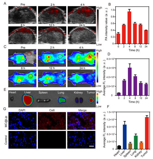 To demonstrate the PA imaging capability of MC@Lip, 4T1 tumor-bearing mice were intravenously administrated with MC@Lip, followed by in vivo PA imaging at tumor sites at different time points. Figure 6A,B clearly reveal that the PA signals of the tumor gradually increased with time and reached a plateau at approximately 4 h after post injection, in consistence with the previous melanin-related report [34,35]. Given that Ce6 has fluorescence imaging capability, we further detected the fluorescence imaging performance of MC@Lip in the tumor. As showed in Figure 6C, the strongest fluorescence signal of the tumor could be observed at 4 h post injection due to the EPR effect (Figure 6C,D), in consistence with the in vivo PA imaging of MC@Lip. Additionally, the tumors and major organs were obtained at 24 h post injection to investigate their ex vivo fluorescence imaging and the biodistribution of MC@Lip. Interestingly, Figure 6E,F reveal substantial MC@Lip was retained in the tumor site, thanks to its high stability and long blood circulation duration. Histological analysis of tumor sections showed that lots of red fluorescence signals from MC@Lip could be observed in the tumor received with MC@Lip systemic administration. By contrast, no red fluorescence signals could be found in tumor sections from the PBS control group (Figure 6G).