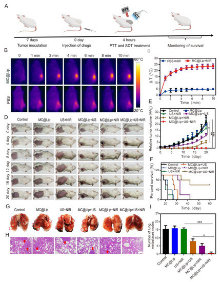 Figure 7A presents the schematic diagram of the in vivo experimental procedure. In detail, the subcutaneous xenograft mice tumor model was initially established by subcutaneously administrating 4T1 cells into the right flank of female BALB/c mouse. Seven days later, after 4 h post injection of MC@Lip, the 4T1 tumor-bearing mice were treated with 5 min ultrasound firstly and then 10 min NIR irradiation to achieve MC@Lip-mediated SDT and PTT. The survival of mice was monitored subsequently for evaluation of the anti-tumor efficacy. Before treatment of the tumor, we firstly optimized the in vivo NIR irradiation time to ensure the photothermal performance of MC@Lip in the tumor-bearing mice. MC@Lip or PBS was intravenously administrated into the tumor-bearing mice and followed by NIR (808 nm, 1.00 W cm−2) irradiation of the tumors at 4 h post injection. The tumor temperature change was recorded by an infrared (IR) thermal camera. From Figure 7B,C, we can see that the surface temperature of the tumor went up from 29.1 ± 0.5 °C to 52.7 ± 1.3 °C along with the laser irradiation time, achieving a temperature elevation platform until 10 min (ΔT over 20 °C). By comparison, the surface temperature of the tumor in PBS-injected mice only elevated to around 4.8 ± 0.5 °C after 10 min of laser irradiation. Then, the 4T1 tumor-bearing mice were randomly divided into six groups, including: Control group, MC@Lip group, US + NIR group, MC@Lip + US group, MC@Lip + NIR group, and MC@Lip + US + NIR group. The relative tumor volume of V/V0 and relative body weight of W/W0 were used to normalize the tumor volume and body weight change recorded every other day. Obviously, Figure 7E demonstrates that there was not a significant tumor growth inhibition effect in the control, MC@Lip, and US + NIR groups. By contrast, significant tumor growth inhibition was found in the MC@Lip + US group and MC@Lip + NIR group, indicating that MC@Lip-based SDT or PTT harbored a good anti-tumor effect. Notably, treatment with MC@Lip + US + NIR produced the strongest tumor growth inhibition performance, resulting in complete tumor regression in all tested tumor-bearing mice after 20 days (Figure 7D,E). Significantly longer survival time was also found in the MC@Lip + US + NIR group in comparison to other control groups, where all mice died within 18-26 days (Figure 7F). No obvious weight fluctuations could be observed for these mice in all groups over 20 days (Figure S10, in the Supporting Information), showing the high therapeutic biosafety of the MC@Lip + US + NIR treatment. To evaluate the suppression effect of tumor metastasis, lungs in all groups were collected. Figure 7G–I clearly revealed that the MC@Lip + US + NIR group showed no noticeable metastatic tumors in the lungs, confirming that the MC@Lip + US + NIR treatment strategy substantially exhibited a robust performance against lung metastasis. Histological analysis of these tumors revealed that the apparent tumor destruction, the least Ki-67-stained cells, and most TUNEL-positive cells appeared in the tumors received with MC@Lip + US + NIR (Figure S11, in the Supporting Information).