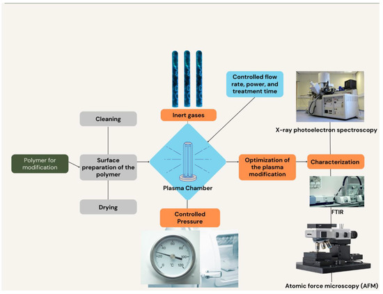 Atmospheric-pressure plasmas are preferred for large-scale surface modification because they can operate at or near room temperature and do not require a vacuum system [15]. This is possible because atmospheric-pressure plasmas are generated using gas mixtures that can sustain a plasma discharge at atmospheric pressure without the need for a vacuum chamber. This allows for the treatment of large surface areas without the need for expensive vacuum equipment, which can be a limiting factor for industrial-scale surface modification processes [18]. Additionally, because atmospheric-pressure plasmas operate at or near room temperature, they can be used to modify heat-sensitive materials without causing damage or altering their properties [17]. Another way to classify plasmas is by their excitation method. The most commonly used excitation methods are DC, AC, and RF. DC plasmas are simple to generate because they only require a DC power supply and a gas to ionize. The power supply can be as simple as a battery or a DC power supply unit, making them easy and inexpensive to set up. However, DC plasmas have limited control over their characteristics because the power supply and gas flow rate cannot be easily adjusted during operation. This can result in non-uniform plasma characteristics and difficulty in controlling the chemical reactions that occur at the plasma–material interface [19]. AC plasmas are more complex and can be used for both low- and high-pressure plasmas [20]. AC plasmas, on the other hand, are more complex because they require a power supply that can switch polarity at high frequencies. This is typically accomplished using a transformer and an AC power supply unit. While this adds complexity to the setup, AC plasmas offer greater flexibility and control over the plasma characteristics. The frequency and voltage of the power supply can be adjusted during operation, allowing for precise control over the plasma density and temperature [21]. This results in a more uniform plasma and better control over the chemical reactions occurring at the plasma–material interface. RF plasmas are frequently utilized due to their capacity to create plasma with high density and uniformity, which is a critical factor for numerous applications such as plasma processing of semiconductors and surface modification of medical devices [22]. This is because high-density plasma can provide better processing results and greater efficiency, while uniformity ensures that the plasma treatment is consistent across the entire surface [23]. Consequently, the use of RF plasmas is essential for achieving precise and reliable surface modifications in these specific applications [24,25]. Plasma sources also vary in their design and capabilities. Several widely employed plasma sources encompass capacitively coupled plasma (CCP), inductively coupled plasma (ICP), and microwave plasma sources. Capacitively coupled plasma (CCP) is a commonly used plasma source for surface modification due to its ability to generate a low-pressure plasma that can be easily controlled. In CCP, a high-frequency electric field is applied between two parallel plates, creating an electric discharge that ionizes the gas molecules and generates a plasma. The low pressure of the plasma and the ability to control the gas flow and power input make CCP ideal for surface modification of various materials [20,26]. The resulting plasma can be used to modify the chemical and physical properties of a material surface, including its wettability, adhesion, and biocompatibility. Microwave plasma sources are becoming increasingly popular for generating low-pressure and high-density plasmas due to their high energy efficiency. Recent advancements in plasma technology have led to the growing popularity of microwave plasma sources. These sources offer high energy efficiency and can generate plasmas at both low-pressure and high-density conditions [26]. This makes them highly versatile and useful for a range of applications, such as materials processing, surface modification, and sterilization. Microwave plasma sources operate by generating an electromagnetic field at microwave frequencies, which excites the gas molecules and creates a plasma [27]. The resulting plasma has a high degree of ionization and a uniform electron energy distribution, making it ideal for various industrial and scientific applications. Figure 1 visually represents the process of plasma modification, showcasing the steps involved in enhancing the surface properties of materials through plasma treatment [28].