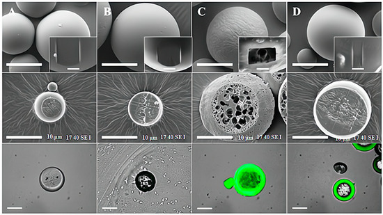Surface morphology analysis is another important aspect of characterizing plasma-treated natural polymer surfaces. The surface morphology of a material is a key factor that determines its physical and biological properties, including roughness, porosity, and surface area [44]. Scanning electron microscopy (SEM) and atomic force microscopy (AFM) are commonly used techniques for the surface morphology analysis of plasma-treated natural polymer surfaces. SEM provides high-resolution images of the surface topography, while AFM provides detailed information on the surface roughness, porosity, and surface area [32,35]. Contact angle measurement is another technique used to evaluate the wettability of plasma-treated natural polymer surfaces. The contact angle is a measure of the degree to which a liquid spreads out over the surface, with a lower contact angle indicating higher wettability [45]. In contrast, the internal structures of microspheres subjected to adsorption and plasma techniques exhibited no discernible alterations when compared to non-modified PDLLGA microspheres. Upon examination using fluorescent microscopy, it was observed that cross-sectioned PDLLGA microspheres modified through both plasma and entrapment methods possessed a fluorescent layer on their outer surfaces. However, minimal fluorescent deposition was observed on the microspheres modified via adsorption, in contrast to non-modified PDLLGA microspheres, which lacked any observable fluorescent layer on their surfaces. Furthermore, the entrapment-modified microspheres exhibited internal fluorescent deposition, whereas no such deposition was found in plasma or adsorption-modified microspheres [46]. The SEM images of PDLLGA microspheres have been sown in Figure 2.