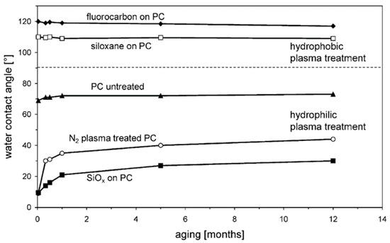 Figure illustrates the effect of plasma treatment on the wettability of aging untreated, plasma-treated, and coated PC sheets. The results show that the polycarbonate surface can be transformed from hydrophilic to hydrophobic, or vice versa, based on the plasma treatment.