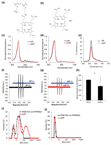 Chemical structure and physicochemical characterization of HP and aHP. (a,b) Chemical structure and illustration of (a) aHP and (b) HP. (c) Absorption spectra of HP and aHP, in which the concentration of porphyrin was 2.5 μM in methanol. (d) Absorption spectra of HP and aHP, in which the concentration of porphyrin was 20 μM in PBS. (e) Fluorescent spectra of HP and aHP in PBS, in which the concentration of porphyrin was 20 μM. The excitation wavelength was 400 nm. (f) ESR spectra of spin trap agent before and after light irradiation to HP at 635 nm. (g) ESR spectra of spin trap agent before and after light irradiation to aHP at 635 nm. (h) ESR signal intensity of spin trap agent after light irradiation to HP and aHP at 635 nm. Data are expressed as means ± SD (n = 3). * p < 0.01. (i,j) Size distributions of PMETAC-co-PAPMAA and aHP analyzed via DLS. (i) Intensity- and (j) number-weighted size distributions.
