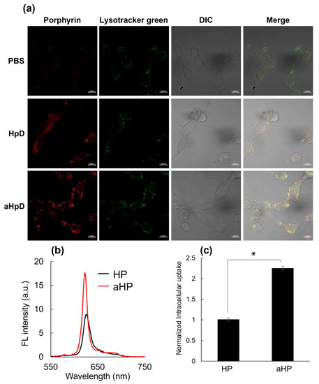 Intracellular uptake of HP and aHP. (a) Laser scanning confocal microscopy images of colon 26 cells incubated with HP or aHP for 24 h. Lysosomes (green) were stained with LysoTracker Green, which is shown in green. Porphyrin fluorescence was shown in red. Those fluorescence images were merged with differential interference contrast (DIC) images. The scale bar is 10 μm. (b) Fluorescence spectra in the cells after treatment with HP or aHP. Excitation wavelength at 400 nm. (c) Normalized intracellular uptake of porphyrin after treatment with HP or aHP. Cells were exposed to culture medium containing 5 μM of porphyrin for 24 h, and the fluorescence of porphyrin into the cells was measured on fluorescence spectroscopy. Data are expressed as means ± SD (n = 4). * p < 0.001.