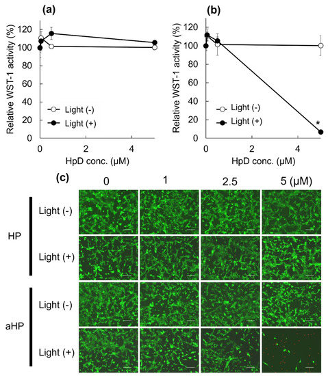 Cytotoxicity profile of the HP and aHP. (a,b) Cytotoxicity profile of the (a) HP and (b) aHP against colon 26 cells in the presence and absence of light irradiation. The irradiation was performed using 635 nm light for 15 min with a density of 14 J cm−2. Data represent the average of normalized WST-1 activity with S.E. (n = 3; * p < 0.01 by unpaired t-test). (c) LIVE/DEAD cell staining of the cells treated by HP and aHP at the concentration of 0, 1, 2.5, and 5 μM. Scale bars: 100 μm.