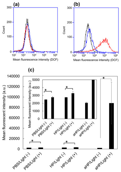 Intracellular generation of ROS in HP/aHP-treated colon 26 cells, stained by ROS-sensitive probe, DCFH-DA. (a) Flow cytometry histogram of the cells without light irradiation. Black: stained cells as a control; blue: stained cells 24 h after adding 5 μM HP; red: stained cells 24 h after adding 5 μM aHP. (b) Flow cytometry histogram of the cells with light irradiation. Black: stained cells as a control; blue: stained cells 24 h after adding 5 μM HP; red: stained cells 24 h after adding 5 μM aHP. (c) Median fluorescence intensity in arbitrary units (a.u.) of colon 26 cells treated with PBS, HP, and aHP in the presence and absence of light irradiation. Data are shown as mean ± standard error of the mean (SEM) (n = 4). * p < 0.05, compared with the PBS treatment.