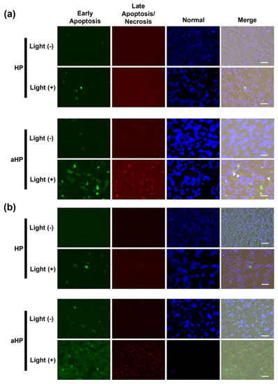 In this study, we evaluated the cytoplasmic ROS levels using DCFH-DA [17]. After its uptake into cells, DCFH-DA is deacetylated by intracellular esterase to become non-fluorescent 2′,7′-dichlorodihydrofluorescin (DCFH). In the presence of intracellular ROS, DCFH is rapidly oxidized and converted to the strongly fluorescent 2′,7′-dichlorodihydrofluorescein (DCF). The intracellular DCF was measured using flow cytometry. First, the amount of DCF in the non-irradiated group was almost the same as that in all groups (Figure 4a,c). In the HP group, the DCF increased 1.2 times following light irradiation compared to non-light irradiation, whereas in the aHP group, it increased by 43 times (Figure 4b,c). To investigate the cell death caused by aHP, the Apoptosis/Necrosis Assay Kit, with three dyes, CytoCalcein Violet 450 (blue), Apopxin Green Indicator (green), and 7-AAD (red) for the detection of live, early apoptotic, and late apoptotic/necrotic cells, respectively, was used. Apopxin detects apoptotic cells by measuring the translocation of phosphatidylserine (PS). In the apoptotic pathway, PS is transferred to the outer cell membrane. The appearance of PS on the cell surface is a universal indicator of the initial and intermediate stages of apoptosis. Neither apoptosis nor necrosis occurred immediately after the irradiation. Three hours after light irradiation, HP-treated cells showed a small number of apoptotic cells (Figure 5a). Interestingly, some aHP-treated cells induced apoptosis at 3 h after light irradiation, and all cells induced apoptosis after 24 h (Figure 5a,b). aHP-treated cells treated with light irradiation significantly altered the cancer cell morphology, causing ballooning (see the cells indicated by the arrowhead in Figure 5a). These results indicate that aHP adheres to the cell membrane and produces an excessive amount of 1O2 near the cell membrane when exposed to light, causing apoptosis through oxidative damage to the cell membrane.