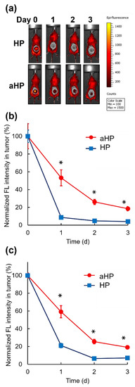 To examine the tissue adhesive property of aHP after subcutaneous injection in the tumor, aHP was administered subcutaneously to the tumor. As shown in Figure 5, 20% of the injected aHP remained in the tumor even on day 3 after the local injection, whereas HP rapidly diffused and disappeared on day 1 after the injection. With light irradiation of the tumor tissue at 78 J cm−2, no photobleaching occurred. Based on this result, locally administered PDT using aHP allows for light irradiation for three consecutive days. When light irradiation was performed for three days after subcutaneous injection of aHP on the tumor sites, the anti-tumor effect of aHP was higher than that of low-molecular-weight HP. This is not only due to the intratumor persistence of aHP but also due to its high anti-tumor efficacy and apoptotic activity.