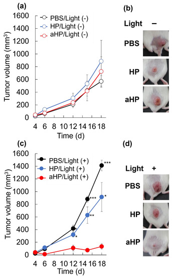 Here, we performed PDT for three consecutive days to confirm the anti-tumor effect of aHP in tumor-bearing mice. No anti-tumor effects were observed in the non-light-irradiated group (Figure 7a,b). When the tumor in the HP-treated mice was irradiated, the anti-tumor effect was not significantly different between PBS-treated and HP-treated mice (Figure 7c,d). In contrast, tumor growth inhibition was clearly observed in the aHP-treated group with light irradiation (Figure 7c,d).