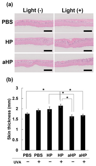 Skin phototoxicity test in rats. (a) H&E staining of back skin on Wister rats intraperitoneally injected with PBS, HP, and aHP 24 h after UVA irradiation. The scale bars: 2.5 mm. (b) Changes in back skin thickness on Wister rats intraperitoneally injected with PBS, HP, and aHP 24 h after UVA irradiation. Data are shown as mean ± SEM (n = 3). * p < 0.05.