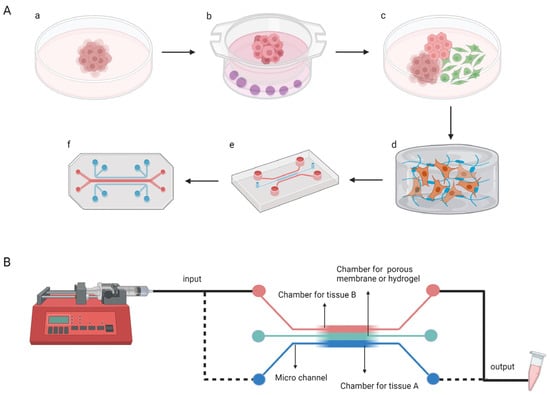 Brief introduction to OCs. (A) Drug screening cell models: (a) Cells cultured in 2D. (b,c) Several types of cells cultured separately and then assembled together. (d) Cells cultured in a 3D matrix. (e,f) Cells cultured in a microfluid system and distributed by design. (B) Primary composition of OCs, including a microfluidic system and cell culture chambers.