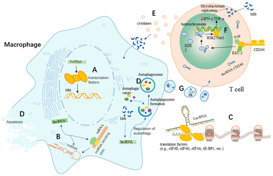 Potential roles of lncRNAs in TB. (A) LncRNAs regulate the transcription factors involved in DNA damage, repair, and genome stability. (B) LncRNAs regulate the activity of miRNAs. (C) Regulation of protein translation by lncRNAs. (D) LncRNAs regulate apoptosis and autophagy in macrophages upon Mtb infection. (E) T cells promote host defense by releasing Th1 cytokines to act on Mtb-infected macrophages. (F) A proposed model for the involvement of lncRNAs in adaptive immunity against Mtb. LncRNA-CD244 localizes in the nucleus and mediates the recruitment of the polyoma protein EZH2, which trimethylates H3K27 of the IFN-γ and TNF-α promoters, thereby inducing suppressive chromatin (heterochromatin) at the inf-g and tnf-a motifs [26]. (G) Exosomes mediate intercellular information exchange.