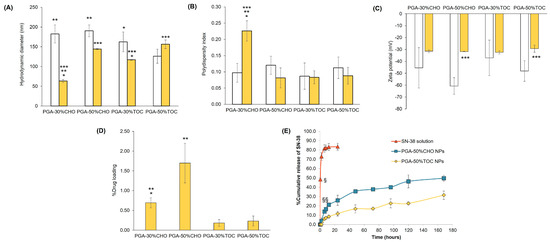 Hydrodynamic diameter (A, nm), polydispersity index (B, PDI), zeta potential (C, mV), and %drug loading (D) of blank and SN-38-loaded PGA-CHO and PGA-TOC NPs (n ≥ 3); release profiles (E) of SN-38 solution and SN-38-loaded PGA-CHO and PGA-TOC NPs (n = 3). * Significantly different comparing between 30% and 50% mole grafting; ** significantly different comparing between PGA-CHO and PGA-TOC at an equal mole grafting; *** significantly different comparing between blank and drug-loaded NPs; § significantly different comparing the SN-38 release of NPs and solution; and §§ significantly different comparing the drug release of PGA-CHO and PGA-TOC NPs.