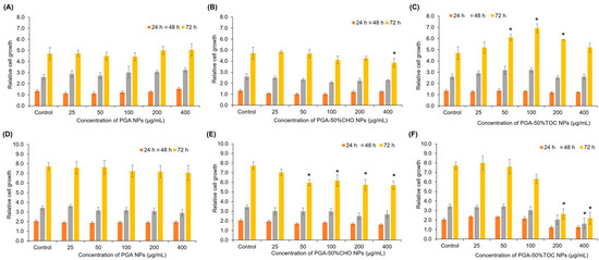 Proliferative profiles of PGA NPs (A,D), PGA-50%CHO NPs (B,E), and PGA-50%TOC NPs (C,F) in HDFa (top row) and MDA-MB-231 (bottom row) cells, n = 3. * Significantly different compared with the control group at an equal incubation time.