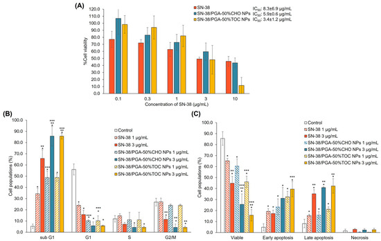 Cytotoxicity (A), cell cycle (B), and apoptotic (C) profiles of MDA-MB-231 cells after treatment with SN-38 (1 and 3 µg/mL) and SN-38-loaded PGA-50%CHO and PGA-50%TOC NPs equivalent to 1 and 3 µg/mL of SN-38 for 48 h (n = 3). * Significantly different compared to the control group; ** significantly different comparing between 1 and 3 µg/mL of SN-38 after treatment with the same sample; and *** significantly different compared to the cells treated with SN-38 solution at a similar concentration.