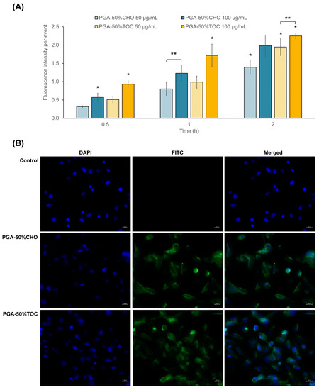 (A) Fluorescence intensity per events of MDA-MB-231 cells after exposure to coumarin-6 labeled PGA-50%CHO and PGA-50%TOC NPs at 50 and 100 µg/mL for 0.5, 1, and 2 h. An error bar indicates standard deviation (n = 3). * Significant difference when compared to the values at other time points; and ** significant difference when compared to the values at different concentrations. (B) Confocal laser scanning microscopic images of MDA-MB-231 cells after 2 h of incubation with 100 µg/mL coumarin-6-labeled PGA-50%CHO and PGA-50%TOC NPs compared to the untreated cells (control). DAPI and FITC channels illustrate the blue and green colors of Hoechst 33342-stained nuclei and coumarin-6-labeled NPs, respectively. The images were captured at a magnification of 40×. A scale bar indicates 20 µm length.