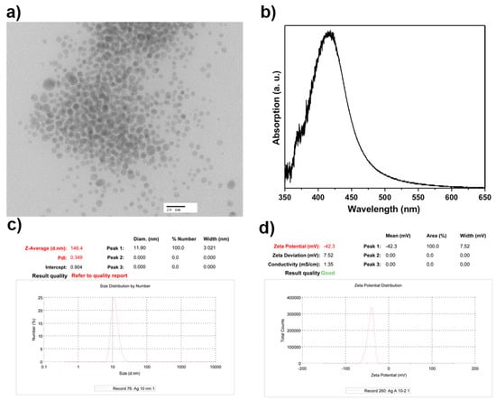 Characterization of silver nanoparticles. (a) Representative TEM microphotograph of the AgNPs. (b) Surface plasmon resonance observed at 420 nm. (c) Representative distribution curve of the hydrodynamic AgNPs diameter. (d) Zeta potential of the AgNPs.