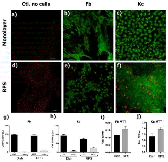 Viability assay of fibroblasts and keratinocytes on RPS. The photographs show cell viability analysis by calcein (live-green) and EthD-1 (dead-red), in the top panels (b,c) cells seeded in cell culture dishes as control are shown, and at the bottom panels (e,f), the cells seeded on RPS are shown. (a,d) show the photographs corresponding to RPS without cells. Graphs in g and h illustrate the percentage of live and dead (g) fibroblast and (h) keratinocytes, respectively, according to live/dead immunofluorescence assay in comparison with cells when cultured in monolayer (standard tissue culture plates). Graphs in (i,j) show the MTT assay results for (h) fibroblast and (j) for keratinocytes. In MTT assays, no significant differences were observed with the control in any case, using the Student’s t-test. Scale bar: 50 μm.